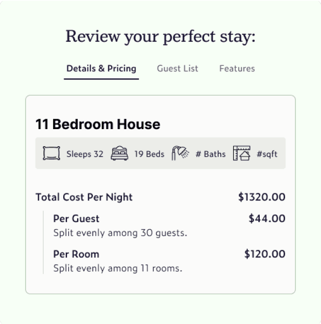 We accompanied “Heads In Beds” with a cost breakdown tool to illustrate how a trip could be split monetarily between rooms and guests. Once users place each guest in a room, they can share a link with trip details to others in their group.
