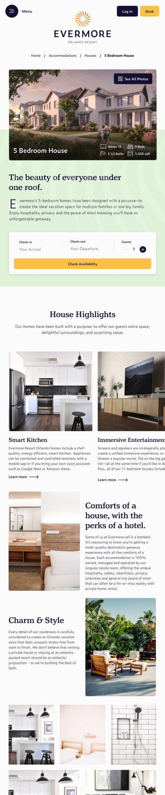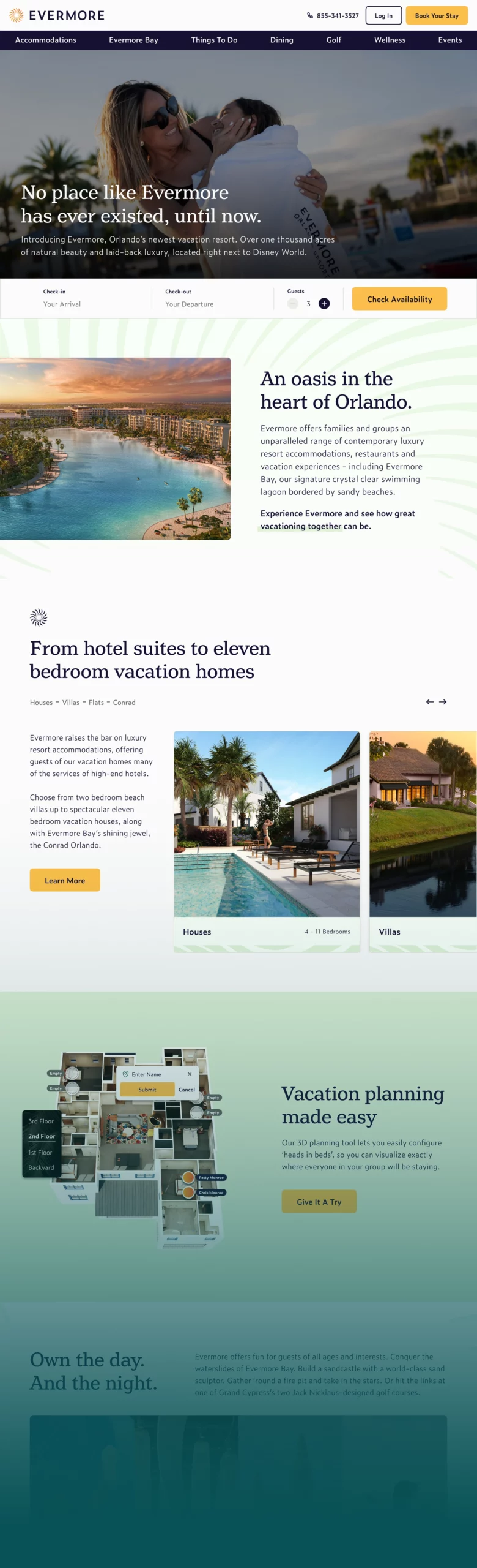 Offering villas, flats, and a neighboring hotel, Evermore is a unique vacation destination that marries the freedom of a vacation rental home with the service and amenities of a luxury resort. And after giving Evermore a unique brand identity, we were ready to build a website experience encompassing what guests could come to expect during their stay—along with features they would never see coming. With new, innovative technology, including booking tools and integrations designed to make every step of vacation easier, our finished website offers guests an interactive, smart, and user-friendly experience from browsing and booking to shopping and activity add-ons.