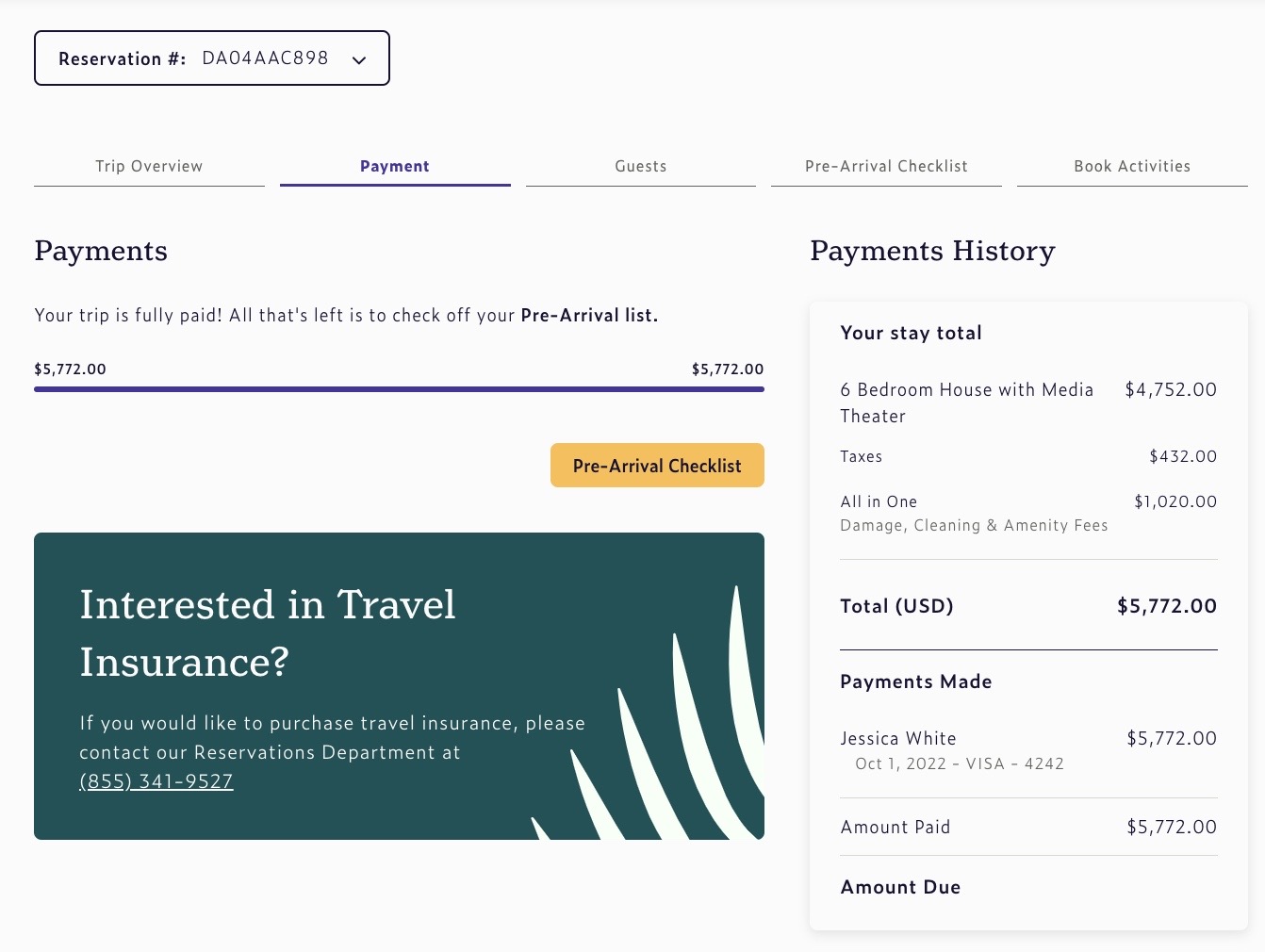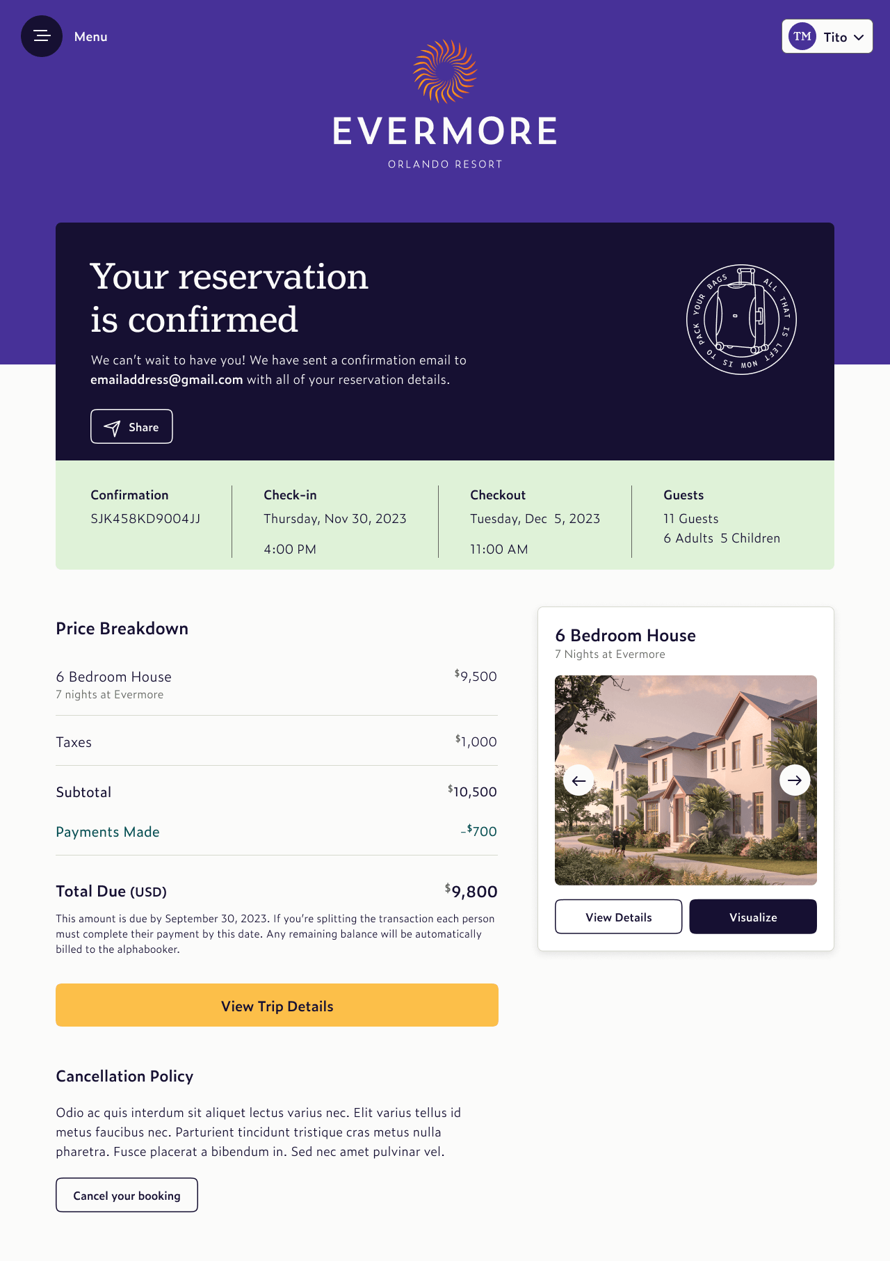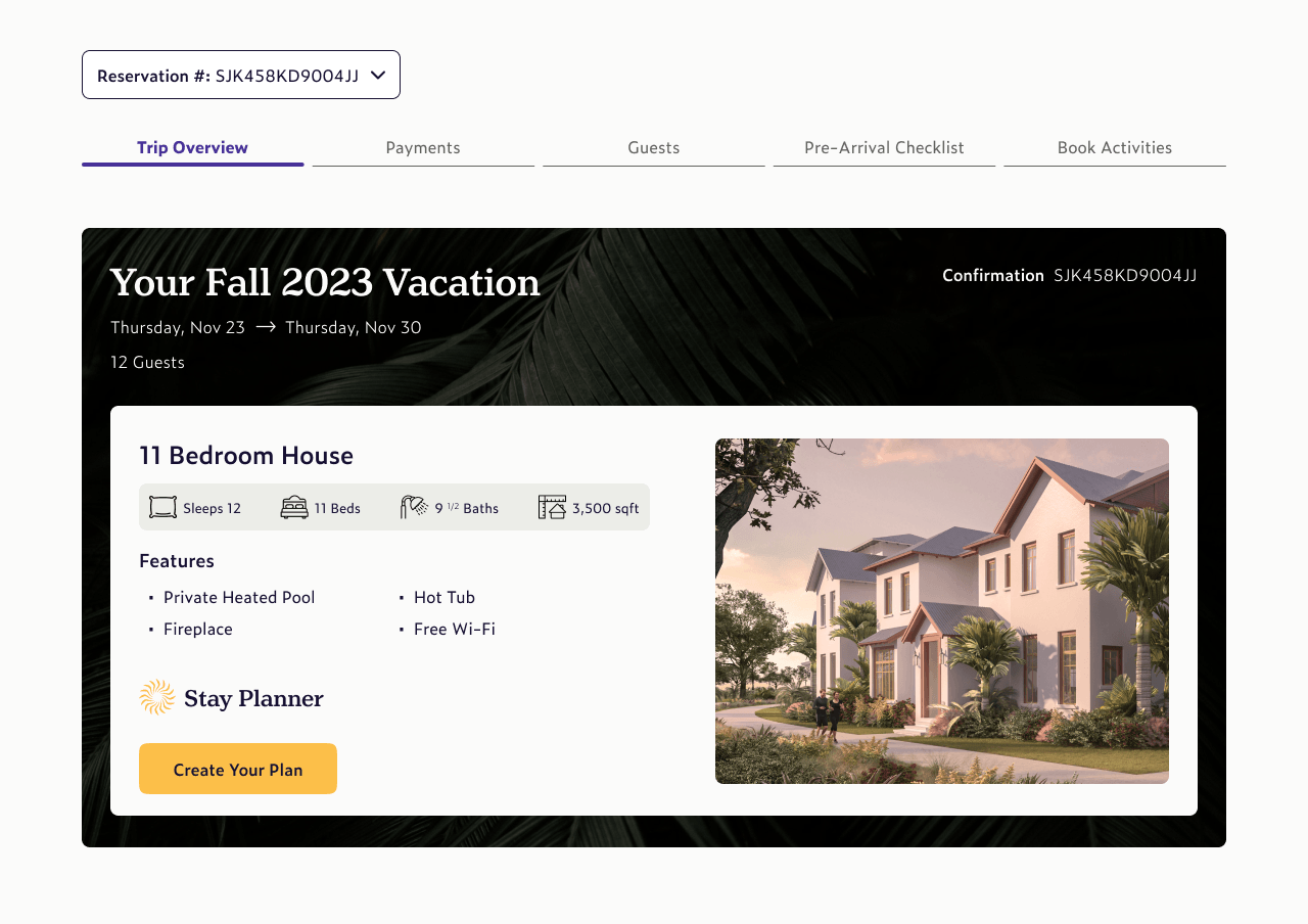 Upon account creation, we wanted users to have a hub for all things vacation planning. So we created an extensive Account Center allowing users to view trip overviews, manage their guest list, access payment status breakdowns, submit follow-up payments, shop and book on-site activities, and quickly find additional site features like “Heads In Beds” and Split Payments.